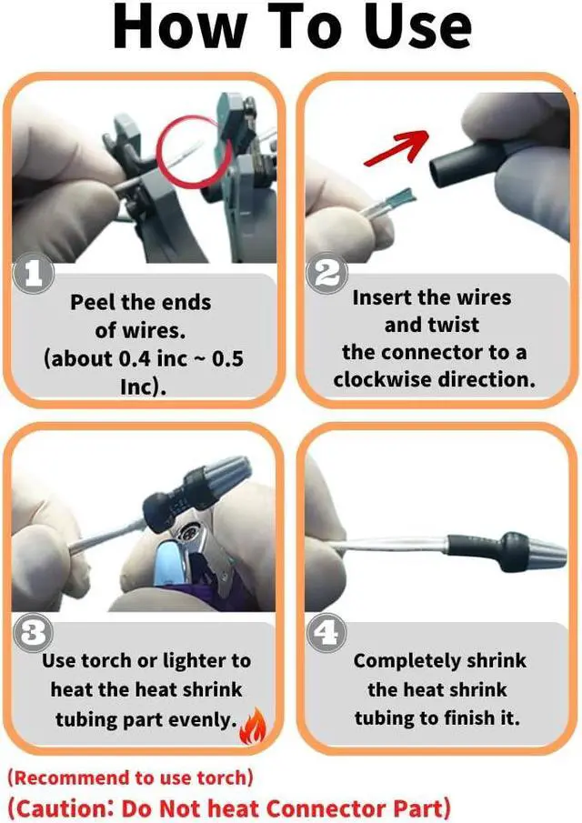 Distinction 1. (Efficiency): Shrink tubing shrinks to 4:1 ratio. Product numbers are printed on tubes for quick and easy size selection. A strong adhesive tubing prevents wires from being loose due to shaking or pulling. Copper to copper connections only.