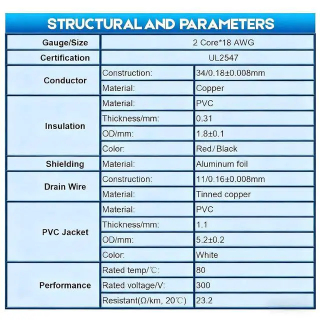 • 2. 18 AWG Oxygen-Free Copper Wire: 98% stranded copper conductors with low resistance to ensure stable power delivery in audio systems, industrial and household circuit.
