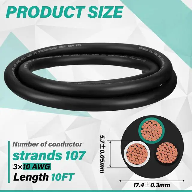 You Will Receive: a 3 conductor SOOW cable cord wire, 10AWG, 10 ft in length, made from stranded pure copper conductor material, designed for heavy duty applications and can withstand harsh environments
