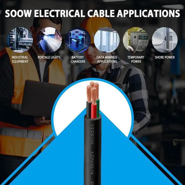 Tough Conditions: Our Heavy Duty 12 AWG 600V SOOW (Service, Oil, and Water Resistant) cable (25 FT - 4 Conductor) is the first choice for industrial, commercial, and outdoor uses. With its insulated design and robust PVC jacket, it' s built to withstand oils, acids, water, and chemicals, ensuring reliability in even the harsh environments.