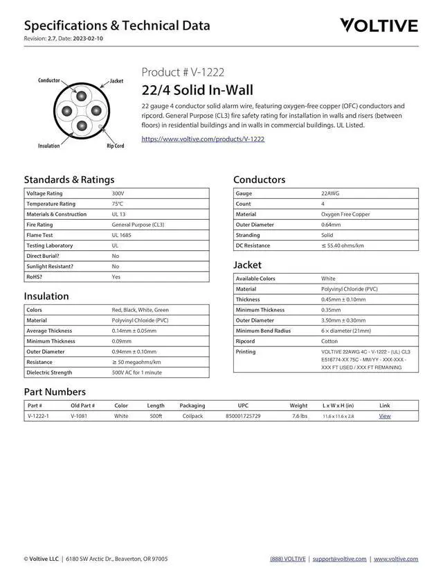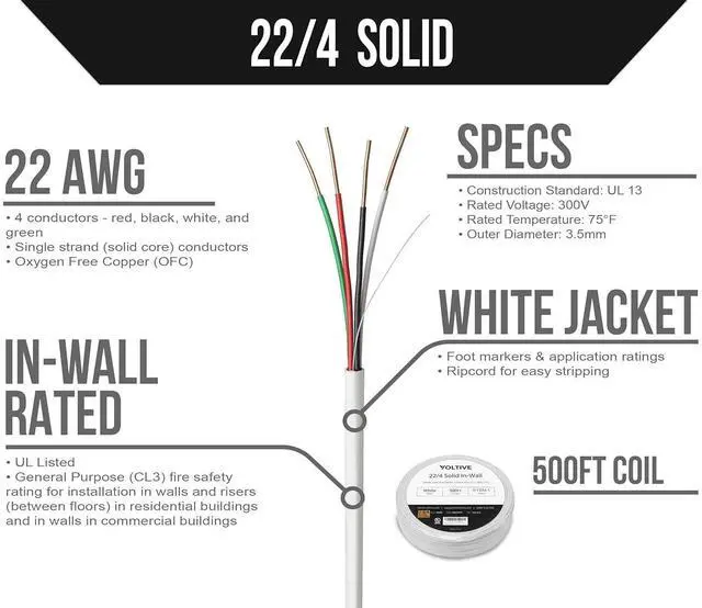 22AWG, 4 CONDUCTORS, WHITE JACKET, 500FT COILPACK. 22 gauge, 4 conductor alarm wire with solid bare copper conductors and cotton ripcord. Built to exacting standards with zero compromises.