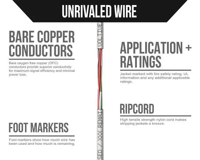 TIME SAVING FEATURES. Ripcord reduces installation time. Jacket is printed with UL information, re-order part number, and foot markers which indicate precisely how much wire has been used and how much is remaining.
