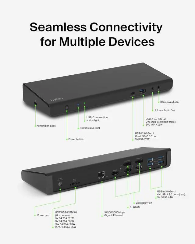 A one-stop shop for connectivity, this universal triple-display DisplayLink docking station is a complete solution to connect your USB-C laptop to a wide array of devices. Build the ultimate workstation with 11 total ports for: USB-A 3.0 (front), USB-C 3.0 (front), 3.5mm audio out, 3.5mm audio in, 85W PD USB-C 3.0 (back), 4x USB-A 3.0 (back), 3x HDMI, 2x DisplayPort, and Gigabit Ethernet. With this multipurpose gadget, you can now create to your hearts content, courtesy of connecting to multiple 4K monitors for crystal-clear resolution while you watch, edit, or surf the web. Adopting PD charging technology and upstream charging function through USB-C interface, it provides up to 85W of power delivery with a PSU of up to 150W. Ideal for the car, plane, even a train this travel-friendly adapter is compatible with MacBook, Chromebook, or PC. And with 1Gb Ethernet youll always have dependable internet.