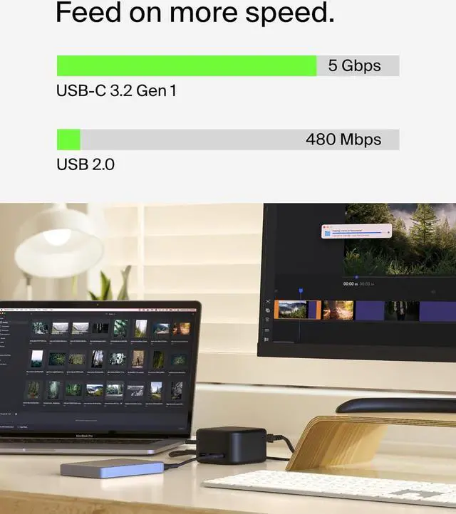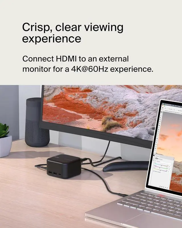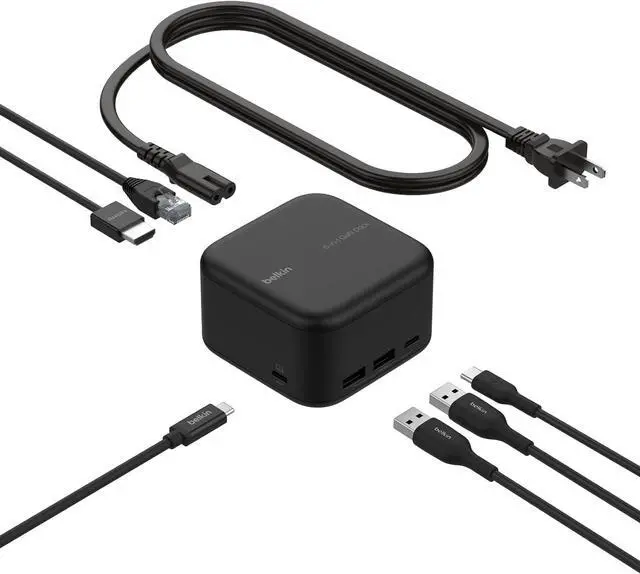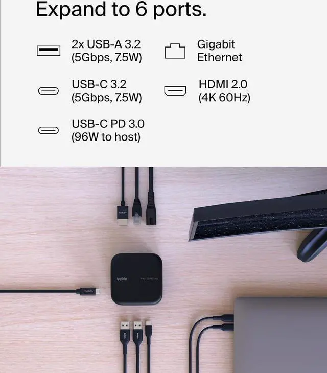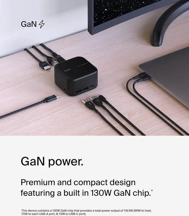 This 6-in-1 USB-C docking station integrates GaN technology with a compact design for charging at home or on-the-go. 130W PD to host and 96W to peripherals ensures you never have to choose between port expansion and power. You have access to ports that newer laptops have left behind, plus the ability to connect a single monitor through HDMI for crystal-clear 4K@60Hz resolution. And with a compact design, this Belkin 6-in-1 dock presents a tidy solution for desktop users both at home and in corporate settings. A 5-point safety system ensures your connected devices remain safe, while the included 2-year warranty allows you to purchase with added peace of mind.