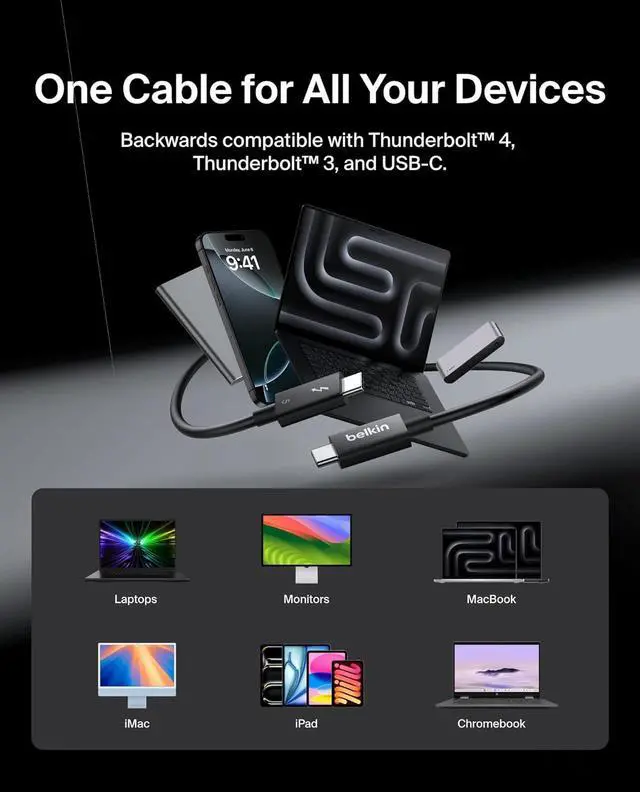 INTEL-CERTIFIED + UNIVERSAL COMPATIBILITY: This cable guarantees tested quality and performance by Intel while working universally with older Thunderbolt 4, Thunderbolt 3, USB4, and USB-C devices for flexibility and functionality across all USB-C ports.