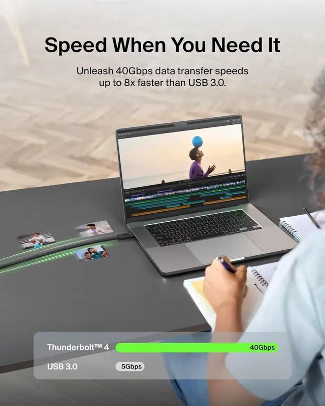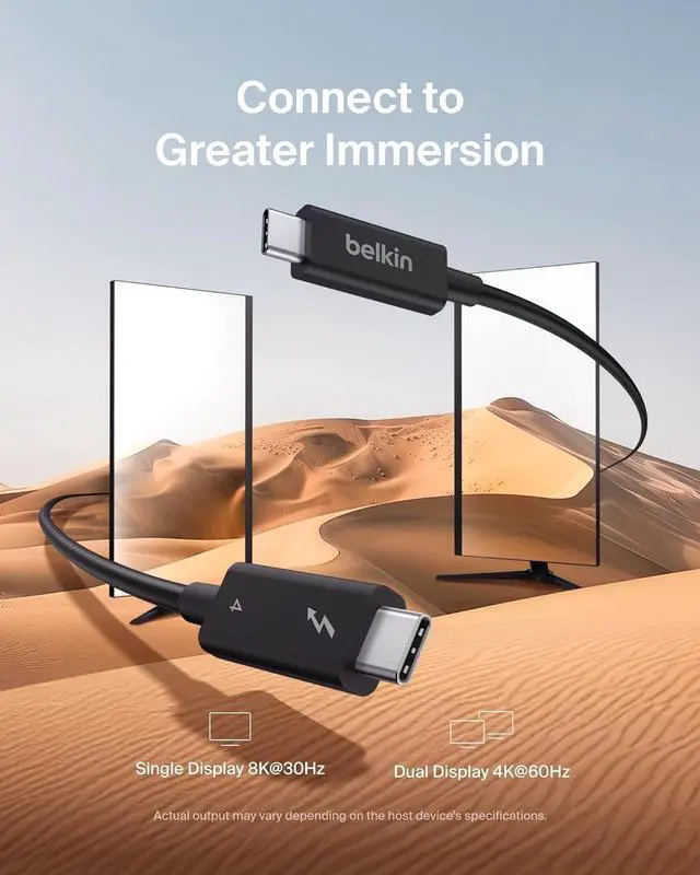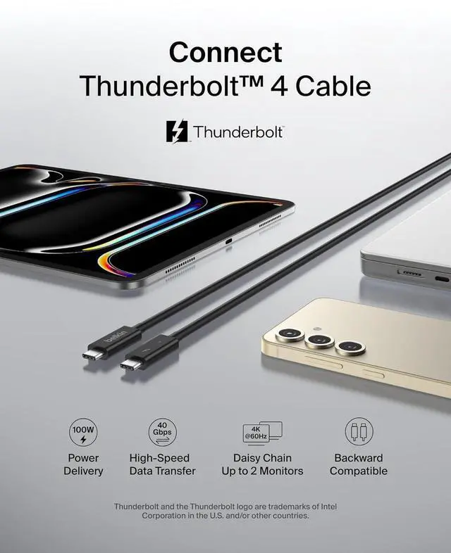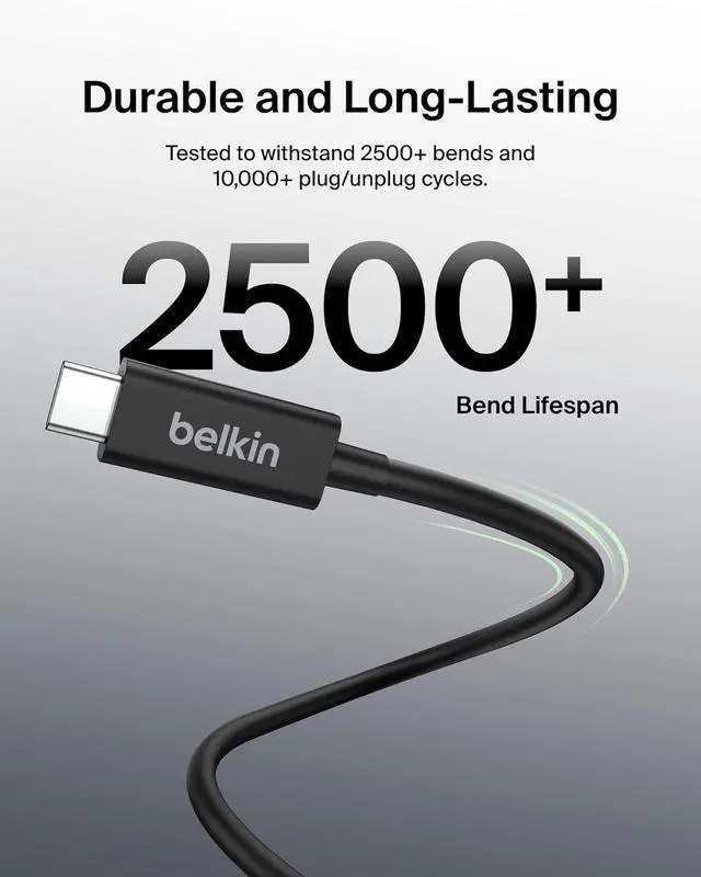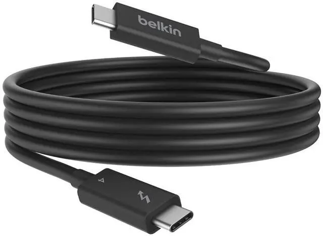 A smarter, faster charging cable. Meet the next generation of Thunderbolt technology the Belkin Thunderbolt 4 Cable. Made to be 8 times faster than USB 3.0, this power cable makes multitasking across multiple devices effortless. Charge your MacBook Pro, Samsung smartphone, Galaxy Tablet, eCPU, and more while on the go with our Belkin USB-C to USB-Ccable. Our certified Thunderbolt 4 cable is fully compatible with Thunderbolt 3, USB4, USB 3.2, and USB2.0, giving you top-tier connectivity in a full-featured power cable. Get access to up to 40 Gbps of bandwidth with this active Thunderbolt 4 cable. Achieve ultra-fast data transfer speeds, up to 8K@30hz video, and up to 100W of Power Delivery all at the same time, and all with one cable! Transferring data between numerous devices at up to a staggering 40Gbps has never been easier (or faster!). Delivering the fastest, most versatile connection to any dock, hub or port, display or data devices, this C cable is ideal for large volume data and Ultra HD displays. Plug this USB-C to USB-C cable into your docking station for fast charging and high-speed data transfers. Recognized by The Verge for its 2M/6ft length, these Belkin charging cables make it convenient to use multiple products at the same time no need to look for multiple outlets in the same area! This 100W USB-C cable can be paired with our Belkin USB-C Docking Stations. Explore our line of new-age Belkin Thunderbolt 4 charger cables and enjoy easy access to monitors, MacBooks, docking stations, and more!