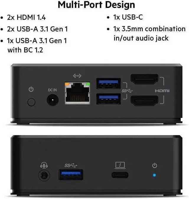 One dock, multiple ports: 2 x HDMI 1.4, 2 x USB-A 3.1 Gen 1, 1 x USB-A 3.1 Gen 1 with BC 1.2, 1 x USB-C, 1 x Gigabit Ethernet, audio input/output