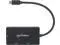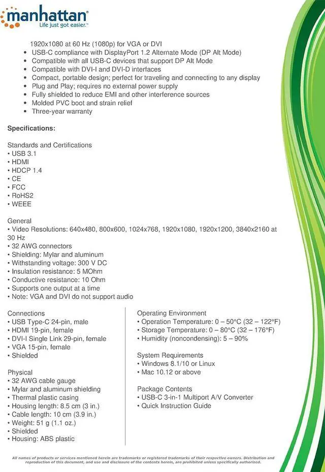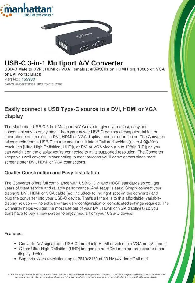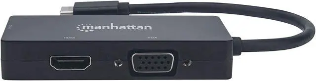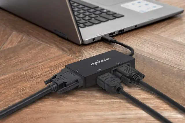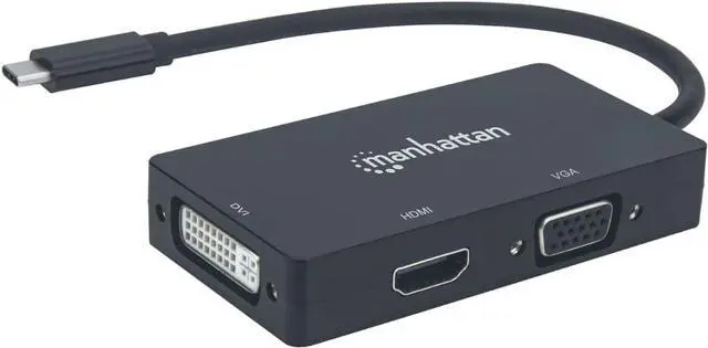 Converts A/V signal from USB-C format into HDMI or video into VGA or DVI format