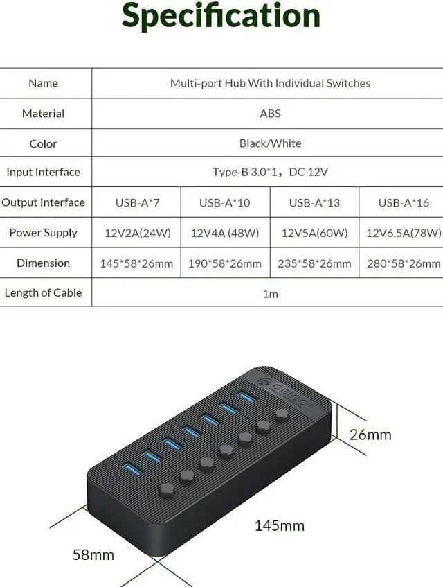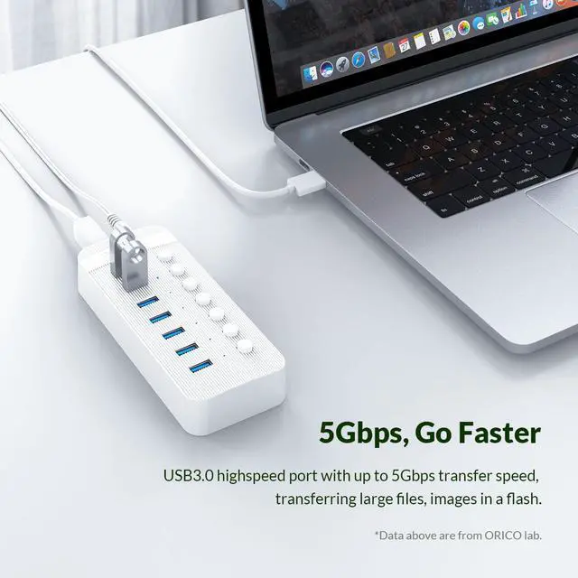 ORICO CT2U3-7AB is a 7-port hub with independent switch, which expands 7 USB3.0-A ports. Each interface supports BC1.2 charging protocol, which can support iPad tablet and other devices.