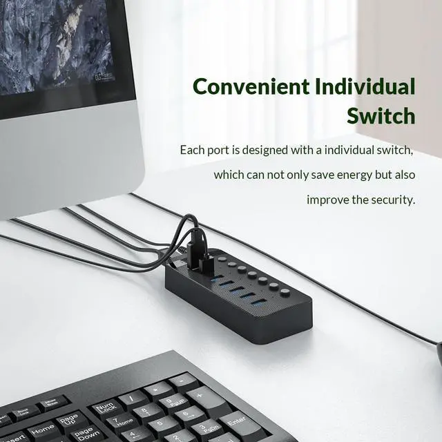 This USB hub has built-in On/Off switches with led indicators for each port, being able to turn on or off the separate USB port without unplugging the equipment, blue LED lights let you know the working status easily. (LED lights only light when you use it)