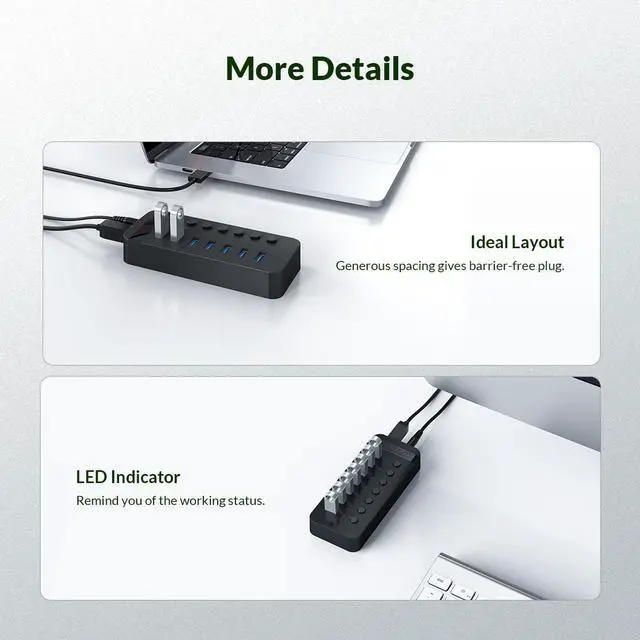 This USB hub has built-in On/Off switches with led indicators for each port, being able to turn on or off the separate USB port without unplugging the equipment, blue LED lights let you know the working status easily. (LED lights only light when you use it)