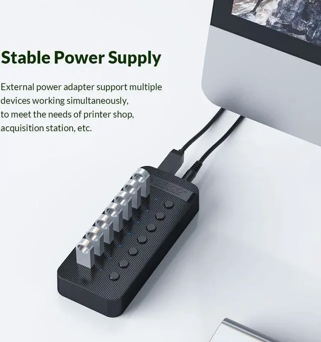 ORICO CT2U3-7AB is a 7-port hub with independent switch, which expands 7 USB3.0-A ports. Each interface supports BC1.2 charging protocol, which can support iPad tablet and other devices.