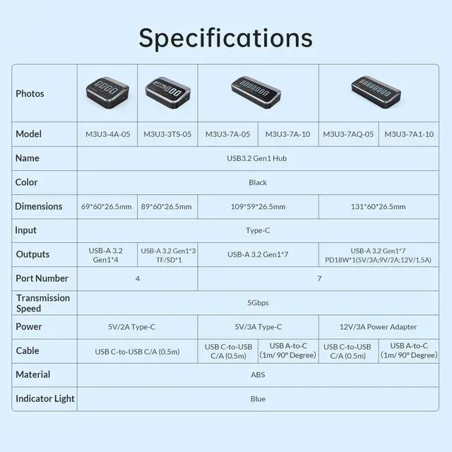 EU/US/AU/UK: USB 3.2 5Gbps * 7+ PD 18W * 1 (5V/3A; 9V/2A; 12V/ 1.5A ), With 12V3A EU/US/AU/UK Power Adpter, USB A to Type c 1m 90 degree Cable