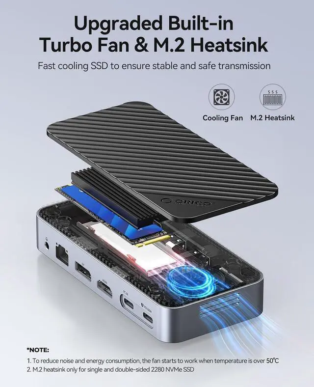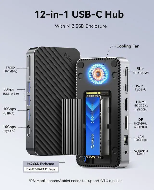 ORICO 12-in-1 USB C Hub with M.2 SSD Enclosure 10Gbps, Tool-Free USB C Docking Station with Built-in Fan, HDMI, DP, Gigabit Ethernet, 100W PD, SD/TF, Audio/Mic, USB A & Type C for Laptop Mac-M2P11