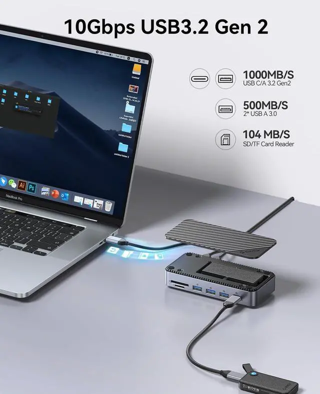 10Gbps High-Speed Dock: Enjoy seamless data transfers via USB-C and USB-A ports at 10Gbps.