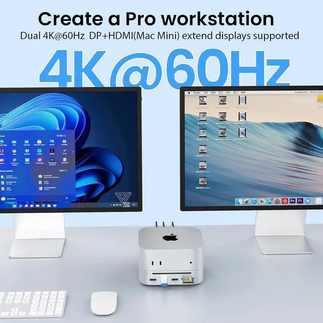 4@144Hz DisplayPortThe Mac mini dock features 4K DP video outputs (DisplayPort 4K@144Hz), providing a flexible and powerful multi-display solution. And Dual Displays with 4K@60Hz can be accessed when working with HDMI Port of Mac Mini. Whether you're editing, designing, gaming, or multitasking, you'll enjoy smooth, detailed visuals and unleash the full potential of your Mac mini M4.