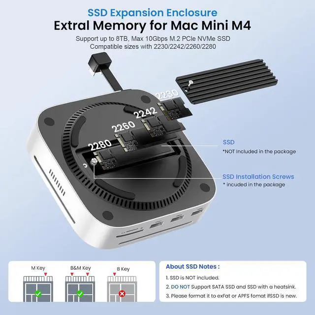 Unleash the Potential of Your Mac Mini with Ultra-Fast Storage ExpansionMac Mini M4 dock with an SSD enclosure that supports up to 8TB of M.2 NVME SSDs and is compatible with most SSD form factors (2230/2242/2260/2280). The Mac mini M4 hub easily provides massive storage expansion and fast backups. Designed for creators and professionals, it keeps your creative assets readily available and streamlines your workflow. Please note: This package does not include an SSD card