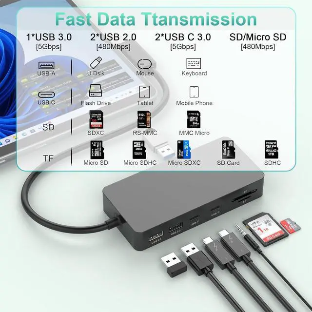 Ultra-High Speed Data TransferMS Pro Dock hub multiport adapter offers USB 3.0 and 2 USB C ports for fast transmission up to 5Gbps. It takes only a few seconds to transfer photos or videos to your laptop. Also with 2 USB 2.0 and TF/SD Card Reader data transfer up to 480Mbps. Perfect for connecting the USB peripherals such as flash drive, hard drive, keyboard, mouse, printer and more.