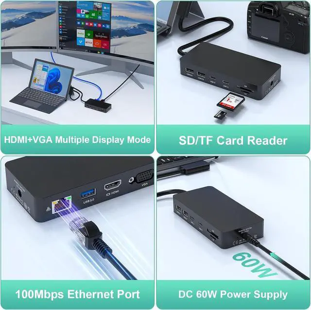 11-IN-1 Docking StationMulti-functional Dock instantly transforms your device into a desktop PC. The dock station uses connection technology, which has high-speed transmission of video, audio and data keep your desktop tidy. 11-in-1 Dual display Pro dock equips with 4K@60HZ HDMI ports, 1080P@60Hz VGA port, Gigabit RJ45 port, 2x USB C Data port, USB 3.0 Ports, 2x USB 3.0 Ports, SD/TF Micro SD card slot, 60W DC Power Supply.