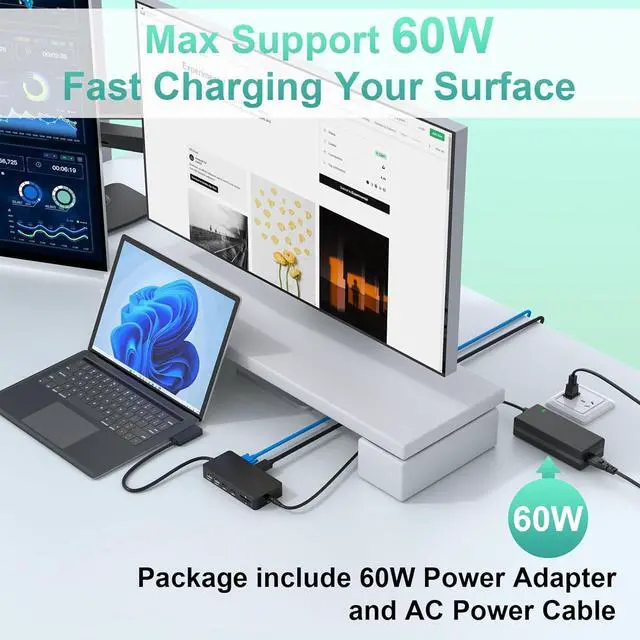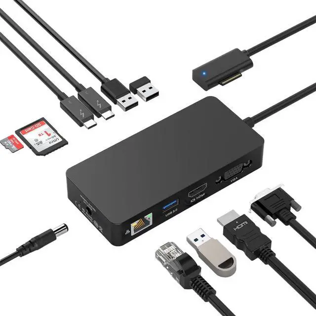 Ethernet Port & 60W Power SupplyPro LAN Adapter offers full 10/100Mbps over RJ45 Ethernet port, which can download movies quicker, transfer files faster, and reduce latency, pro 10 dock ensure your network connection more stable. MS laptop docking station features with 60W power supply adapter, enjoy faster charging speed and improve your office efficiency.