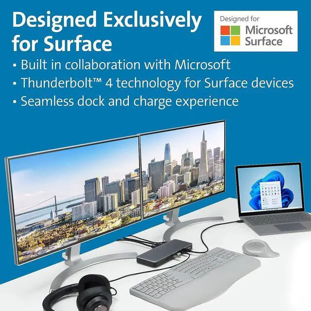 Ideal for professionals and creatives using Thunderbolt based Surface devices who want more speed to work with large files, support for multiple 4K monitors, and more ports so they can connect to accessories without using adapters, the SD5765T Thunderbolt 4 Dual 4K Docking Station is an affordable high-speed dock that provides everything you need to enhance your productivity now and well into the future. Designed exclusively for Surface, the SD5765T Thunderbolt 4 Dual 4K Docking Station provides more speed, more power, and more video options. Delivering 40Gbps data transfer speeds, support for Single 8K or Dual 4K @ 60Hz, two HDMI® ports, multiple USB-C® and USB-A ports, up to 96W of dynamic Power Delivery, and daisy chaining via Thunderbolt 4, the SD5765T provides a true plug-and-play experience and a tidier desktopso you can be more productive and focused.