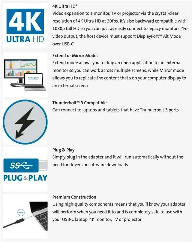Video expansion to a monitor, TV or projector via the crystal-clear resolution of 4K Ultra HD at 60fps. Its also backward compatible with 1080p full HD so you can just as easily connect to legacy monitors. *For video output, the host device must support DisplayPort Alt Mode over USB-C