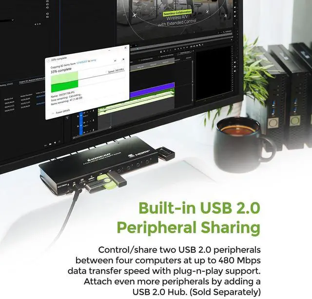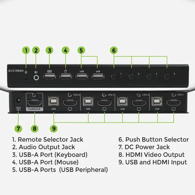 Computer selection via remote port selector, hotkeys, and USB mouse. All HDMI / USB cables and power adapter included for plug-and-play setup and hassle-free installation, no extra purchases needed