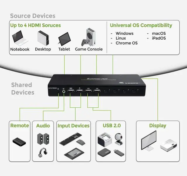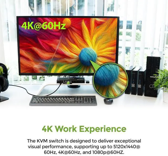 Control up to 4 PCs from a single monitor, keyboard, mouse, speaker and up to 2 USB peripherals. Superior video quality up to 4096x2160 @60 Hz or 5120x1440 @60Hz (HDMI 2.0)