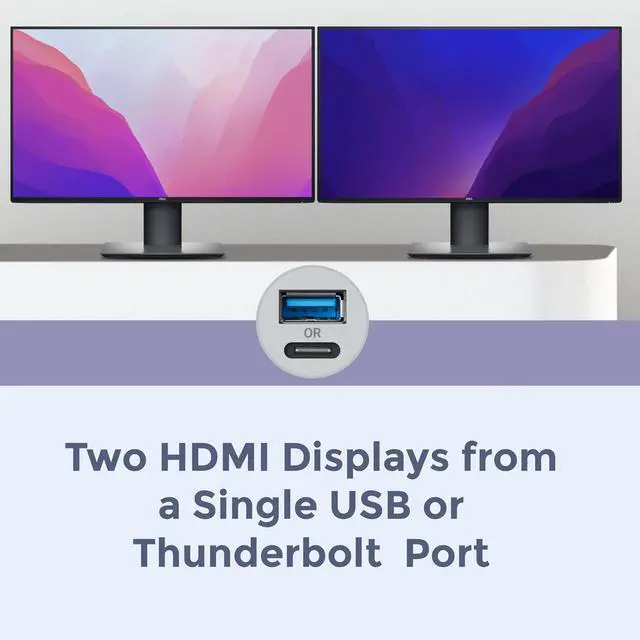 Connects Two 4K @ 60Hz Displays to Macs/Windows Computers Enables connection of two 4K (3840x 2160) @ 60Hz; or two 1440p or 1880p @144Hz HDMI displays to a single Thunderbolt or USB port on your computer.