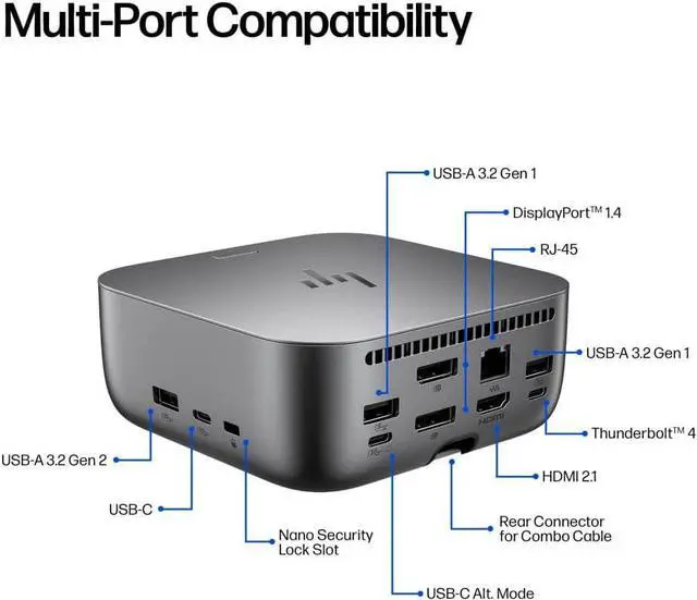 Power Connections HP Quick Connect wakes your devices before you even take a seat. Stay in your flow all day with up to 180W of power delivery and 40 Gbps of data transfer speeds via Thunderbolt 4 technology and all the ports you need to connect your setup.