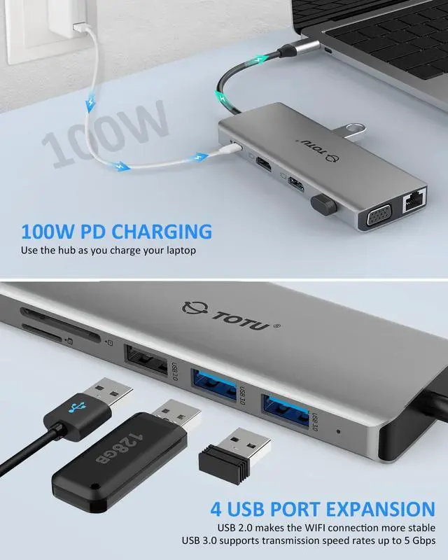 USB 3.1 Gen 1 ports enable faster data transfer speeds up to 5Gbps. The USB-C port powers a compatible laptop with 100W Power Delivery.