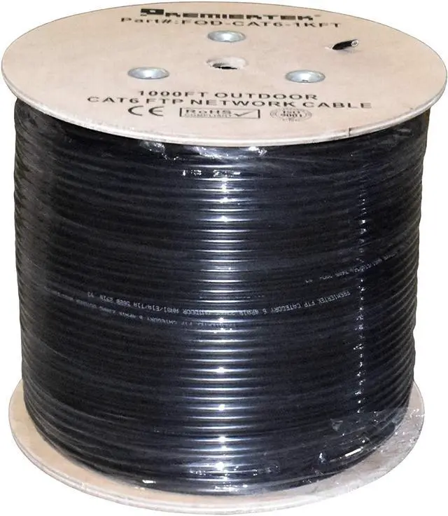 1000-Foot of uncapped, aluminum foil Shielded Twisted Ethernet cable (F/UTP) Premiertek Outdoor 1000' Cat6 23AWG CMX Cca 550MHz Shield FTP 4-Pairs Premium Network LAN Cable, Black (FOD-CAT6-1KFT).