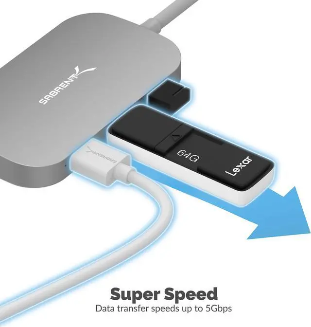 sabrent 8-in-1 usb type-c hub with hdmi (4k) output, 3 usb 3.0 ports, 1 usb 2.0 port, sd/microsd multi-card reader [4k and power delivery support] (ds-uhcr)Introduction With the Sabrent 8 in 1 Type-C Hub you can now connect your laptop or PC to multiple USB devices. The Type-C connection enables you to transfer data at Super-Speeds, extend your display and much more with one single cable connected to your computer. Featuring three USB 3.0 Type-A ports allow Super-Speed file transfers up to 5Gbps. USB 2.0 Type-A port offers a great mouse or keyboard connection.