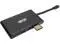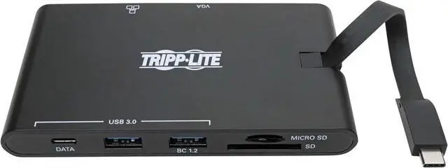 USB-C Docking Station Turns Your Device's USB-C or Thunderbolt 3 Port into a Multiport Workstation The U442-DOCK3-B expands the potential of your tablet, laptop, Chromebook, MacBook, smartphone or PC's USB-C or Thunderbolt 3 port. It's ideal for transmitting 4K video and audio to a large display, adding a thumb drive or other USB peripheral, powering and charging a PD Charging 3.0-compliant mobile device, connecting to a Gigabit Ethernet network and a lot moreall at the same time. Supports USB DisplayPort Alternate Mode for Transmitting Audio/Video Signals With a source device that also supports USB DisplayPort Alt Mode, you can extend video from your primary display to another, duplicate the same video on both displays, or change the second display to your primary. Transmits Crystal-Clear 4K HDMI Video and Digital Audio To send digital audio and Ultra High Definition video to a 4K-ready HDMI television, projector or monitor, connect the corresponding port to the display using an HDMI cable (sold separately). The HDMI port supports UHD video resolutions up to 3840 x 2160 (4K x 2K) at 30 Hz. The VGA port supports high-definition resolutions up to 1920 x 1200, including 1080p, at 60 Hz. You can transmit the same video signal through the HDMI and VGA ports simultaneously with a maximum resolution of 1080p on both. A DVI display may be connected to the HDMI port using an HDMI to DVI adapter (sold separately).Connects Up to 3 USB Peripherals The two USB-A hub ports and single USB-C data port accept USB peripherals, such as flash drives, mice, keyboards and printers, and share a maximum 10W (5V 2A) of power. They support fast USB 3.1 Gen 1 data transfer rates up to 5 Gbps and are backward compatible with USB 2.0 and USB 1.1 devices. The BC 1.2-compliant USB-A port next to the memory card slots provides up to 1.5A of fast-charging power to mobile devices. Charges the Connected Device The USB-C Power Delivery (PD) port provides power and charging to the PD Charging 3.0-compliant device (such as a MacBook, Chromebook or Android smartphone) the U442-DOCK3-B is connected to. Connect the device's AC wall charger to the USB-C PD port, which supports power input up to 100W (20V 5A). When the wall charger is unplugged, the unit's PD 3.0 Fast Role Swap feature ensures all data and power connections remain stable. Accesses a Wired Gigabit Ethernet Network The RJ45 port offers access to a Gigabit Ethernet network when Wi-Fi is unavailable or when a wired connection offers faster speeds. Connect using a UTP cable (sold separately), and enjoy true 10/100/1000 Mbps Ethernet speeds for fast data transfers. Allows External Memory Access The memory card slots support Micro SD and SD/MMC cards for transferring data to and from your connected computer, laptop or tablet. Only one memory card slot can be used at a time. Built-In USB-C Cable Connects in Either Direction Connect the reversible USB-C plug to your source device's USB-C or Thunderbolt 3 port. The fumble-free USB-C plug connects in either direction to ensure fast, easy connection every time. The built-in cable tucks away beneath the compact unit for safe carrying in a pocket, briefcase or laptop bag. Ready to Use Right Out of the Package Enjoy the convenience of one multiport USB-C docking station instead of several different port converters. The plug-and-play USB-C dock for MacBook's, Chromebooks and other devices requires no software, drivers or external power. It's manufactured in compliance with strict RoHS specifications, reflecting Tripp Lite's commitment to environmental responsibility.