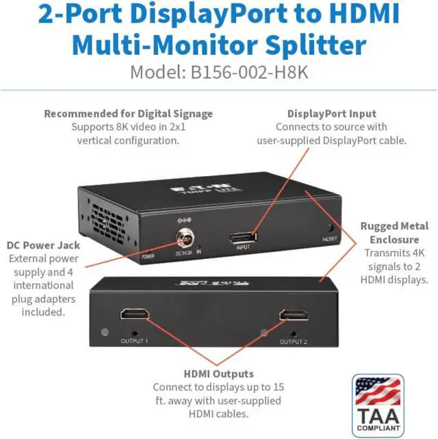 2-PORT DISPLAYPORT TO HDMI SPLITTER: Connects one DisplayPort source device to two HDMI displays up to 8K resolution. Ideal for digital signage, workstations, gaming devices like PCs & consoles, and video wall applications
