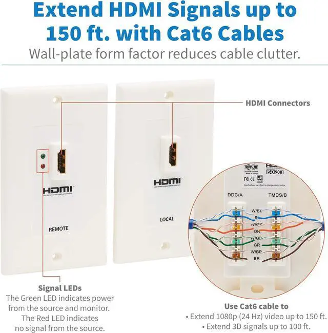 Locate your HDMI display screen up to 230 ft. away from the HDMI source when using 24Awg, Solid Wire Cat5e/6 cabling Supports video resolutions up to 1080P (24Hz) Transfers both digital video and audio signals Hdcp compliant No external power required