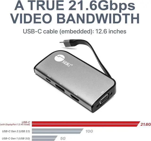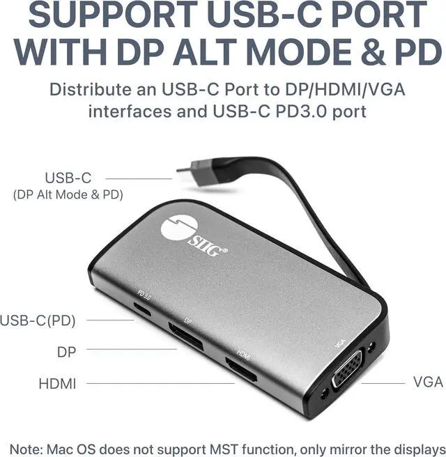 MULTIPORT HUB - This multiport adapter comes with 1 USB Type-C input port, 1 DisplayPort output port, 1 HDMI output port, 1 VGA output port, and 1 USB Type-C charging port