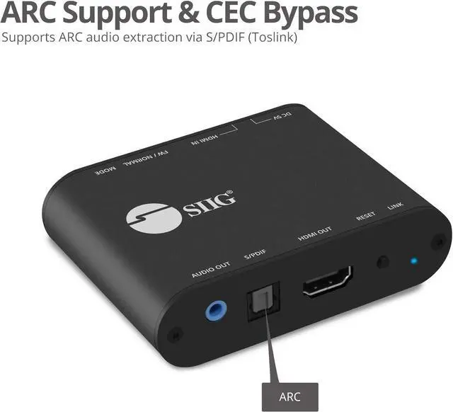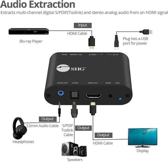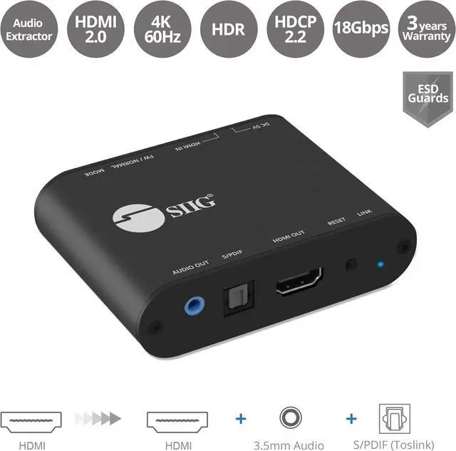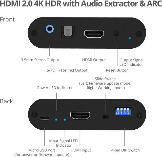 HDMI 2.0 AUDIO EXTRACTOR: Splits incoming HDMI audio signal to stereo audio and Toslink outputs, allowing you to connect to speakers and entertainment systems that do not have an HDMI connection.