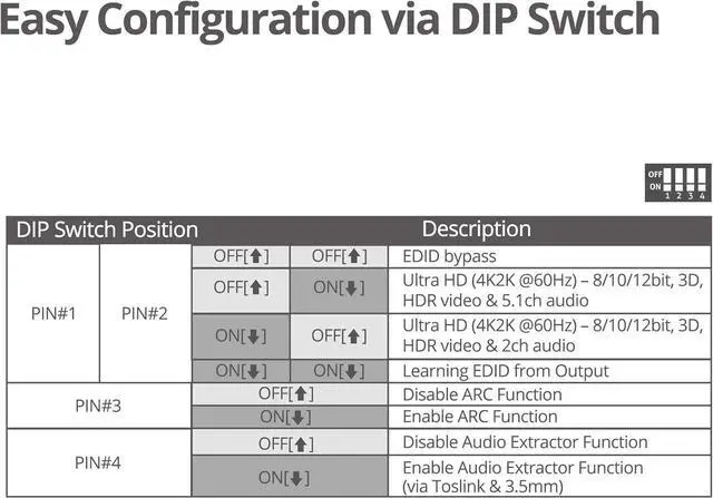 EDID SETTINGS: Manage EDID setting to obtain correct audio output using DIP switch settings to have your audio system performing the way you want