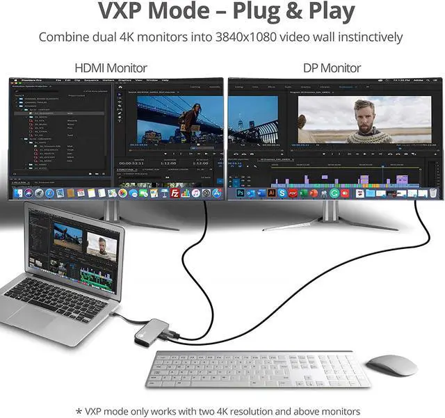 View Xpanding (VXP Mode) video wall supports 3840x1080 resolution, requires dual 4K or dual 1080p displays for Windows or macOS Note: *Requires GPU / graphics card to support at least 3 external displays to use all 2 video ports