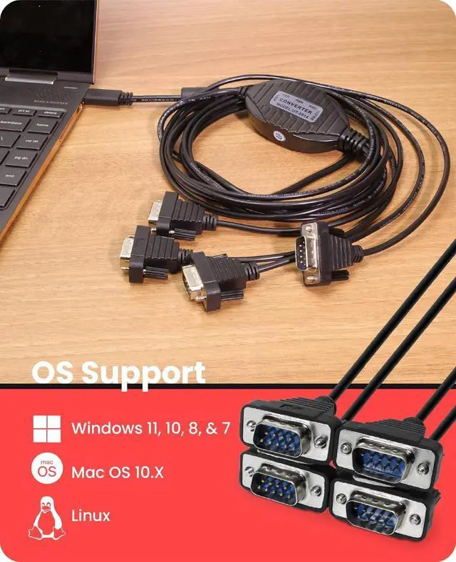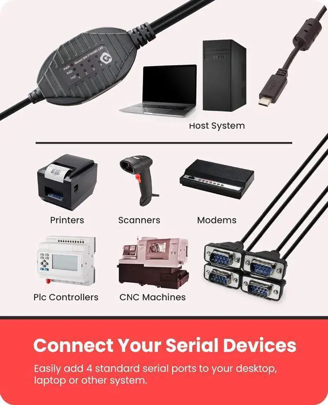 MULTI-USE FUNCTIONALITY - Quad Port Serial Adapter with FTDI Chipset to USB-C, that supports an automatic handshake. Supports full RS232 Handshaking.