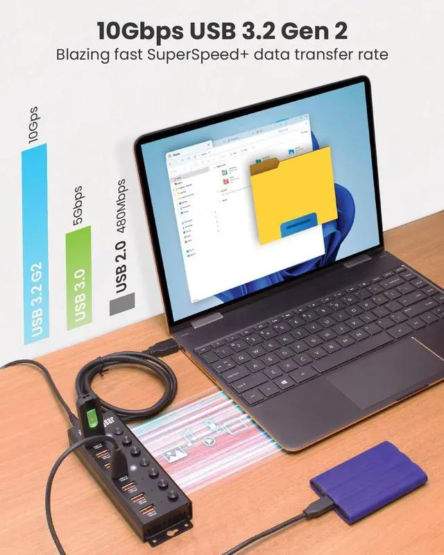 [ Blazing-Fast Data Transfer ] : Experience SuperSpeed USB 3.2 Gen 2 performance on each port, with transfer rates reaching up to 10Gbps, ensuring rapid and reliable data handling for all your connected devices.