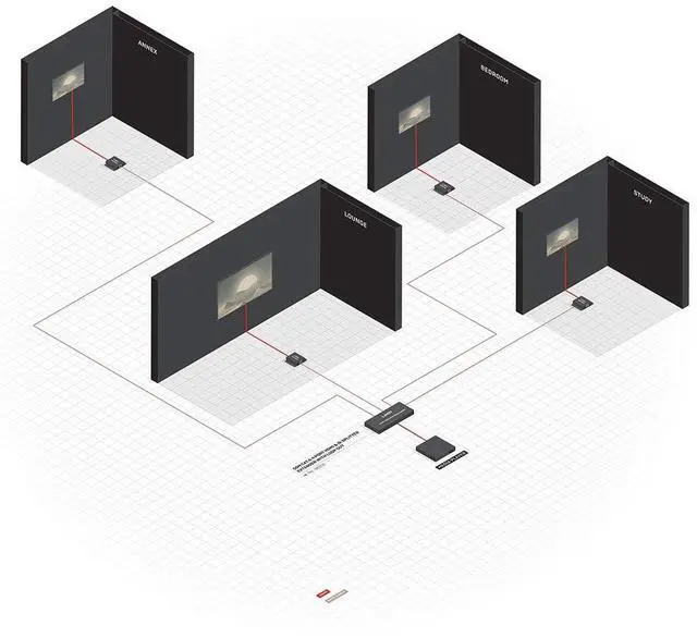 The transmitter's HDMI loop-through allows for simultaneous viewing with a local display for monitoring or an extra viewing zone; for larger installations, the loop-through can cascade up to 3 transmitters, connecting up to 12 displays