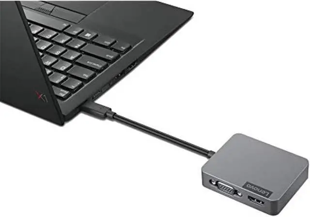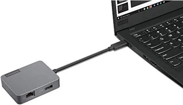 The Lenovo USB-C Travel Hub is a must-have portability solution for all USB-C system users. Whether you're traveling for work, grinding in the conference room, making last-minute updates on the fly, or just need more connection options, this multiport adapter helps make the connection. Through your USB-C port, the hub grants you instant connection to an external monitor, wired network, or a USB device of your choosing. Smaller than the average pack of playing cards and weighing in at just 70 g (0.15 lbs), you can easily carry this USB-C hub in your laptop case or pocket.Whether you're presenting, plugging in, or transferring files, you can be assured this convenient, ergonomic hub has you covered. And with selected ThinkPad notebooks, the 4-in-1 hub provides easy and secure network manageability options. Perfect for home or office, conference rooms and event stages, college students or WFH pros, the Lenovo USB-C Travel Hub makes connecting