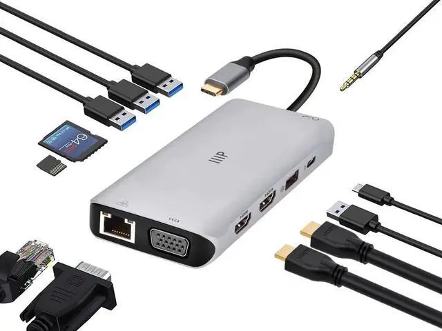 The Monoprice 12-in-1 Dual-HDMI + VGA Universal Triple Display Dock is a compact yet powerful solution to all workplace setup needs. The device extends just one USB-C (with DP1.4 or DP1.2 mode) or Thunderbolt port into 12 ports, including two 4K HDMI and one 1080p VGA display, 4 high-speed USB-A data ports, Gigabit Ethernet port, simultaneous SD/MicroSD card readers (104Mb/s), 3.5mm 2-in-1 audio/mic port, and a USB-C port for 100W Power Delivery passthrough charging. Just plug in the device to start using itno driver or special setup is necessary. Compatible with Windows and MacOS systems.