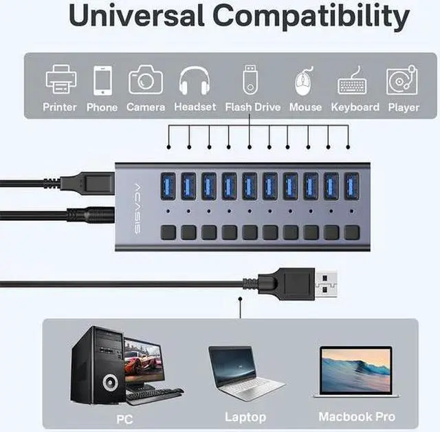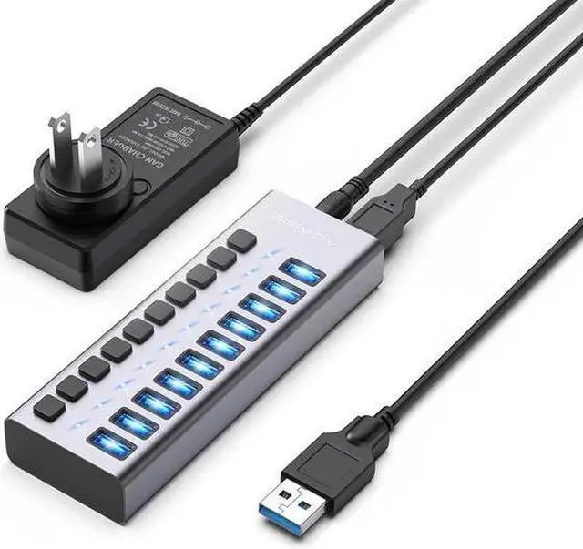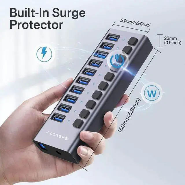 Aluminium Alloy Housing: ACASIS usb hub powered build with quality aluminium alloy, which can helps disspate heat quickly and no worries from falling out from your desk when you plug many devices
