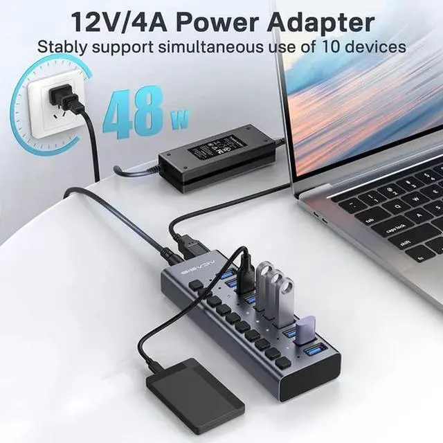 48W Powered USB 3.1 Hub: Come with the 12V/4A UL Certified power adapter, you can charge your devices like mac, mobile phones, tablets or other devices safely without any pressure. Built-in surge protector keeps your devices and data safe and supports hot swapping