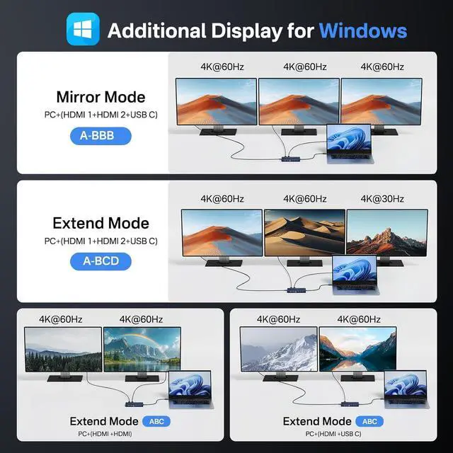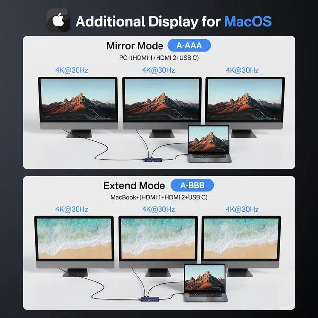 [10Gbps full-featured USB C port]This Laptop USB C Dock is designed with a 10Gbps full-featured USB C port, which not only transfers data at 10GBps, but also supports DP alt mode.So Notebook USB C ports must support DP ALT mode or THUNDERBOLT.This laptop dock can expand 3 monitors with 2 HDMI + USB C Vedio ports. WINDOWS Laptop Support Mirror mode and Extend mode(Display three different screens simultaneously).This USBC hub is the perfectfor USB C monitor!Note: MacOS MST unsupported!!!