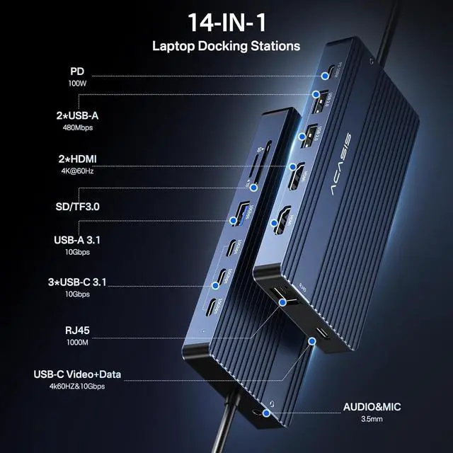 [14-in-1 USB C Docking Station for Laptop] ACASIS USB C Docking Station Dual Monitor easily expands your laptop from a single USB C port to a 14-port mobile workstation, USB C Docking Station 3 Monitor with 2x*HDMI 4K@60+4K USB C, 3*10Gbps USB C 3.1, 10Gbps USB A 3.1, 2xUSB 2.0, SD/TF card reader, 1Gbps Ethernet,3.5mm audio and microphone, and PD 100W charging, as well as a full-featured USB C video port.