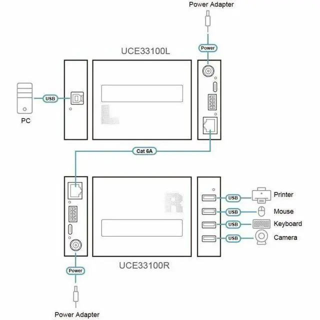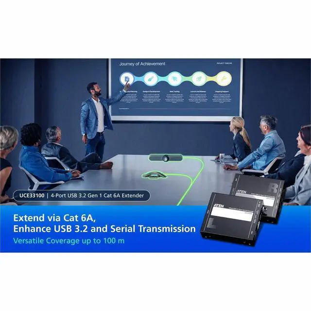 As the scope of meeting rooms continually evolves, it's critical that we keep pace and maintain fast data transmission that extends to a longer distance should the occasion arise. In such cases, the UCE33100 becomes your perfect partner as it extends your USB connectivity across a distance of up to 100 m over a Cat 6A cable to assure a smooth meeting experience and contribute toward your overall operational efficiency at the office. 5 Gbps High-Speed Data Transmission over 100 mTransmit USB 3.2 data at an ultra-high 5 Gbps speed spanning a distance up to 100 m with a Cat 6A cable.